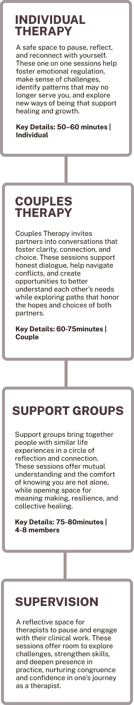 The first session is a gentle starting point. We take time to understand what brings you here, what feels urgent, and what you are hoping for. We aim to foster a sense of safety and trust that aids in the process of sharing and we value taking it slow to honour your boundaries.. We also talk through boundaries, confidentiality and what a supportive therapeutic relationship looks could like for you, setting the foundation for our work ahead.